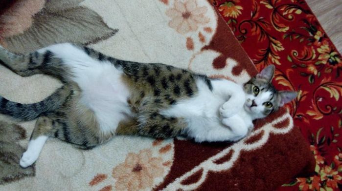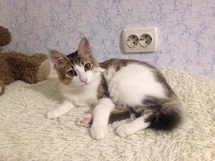 Этого котенка подобрала моя бабушка. Конечно он уже не совсем прям котенок, он обещает быть очент крупным котом. К счастью, нашлась девушка, которая захотела именно его. Перед этим Котея кастрировали. Первое время он дичился. Сейчас нормальный ласковый и любопытный кот. Ждем конца испытательного срока и надеемся, что все будет хорошо.