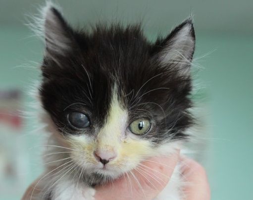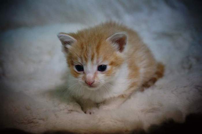 Самая слабенькая крошка Минки. Перенесённая инфекция дала серьёзные осложнения и глазик нужно будет удалять. Как только она чуть-чуть окрепнет проведут операцию. В силу проблем со зрением она самая робкая из всех котяток.