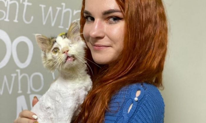 Девчушку нашли на улице. Как она лишилась глаза доподлинно неизвестно, были предположения о ДТП. Но вряд ли в ДТП уцелеет весь котёнок, за исключением глаза.
